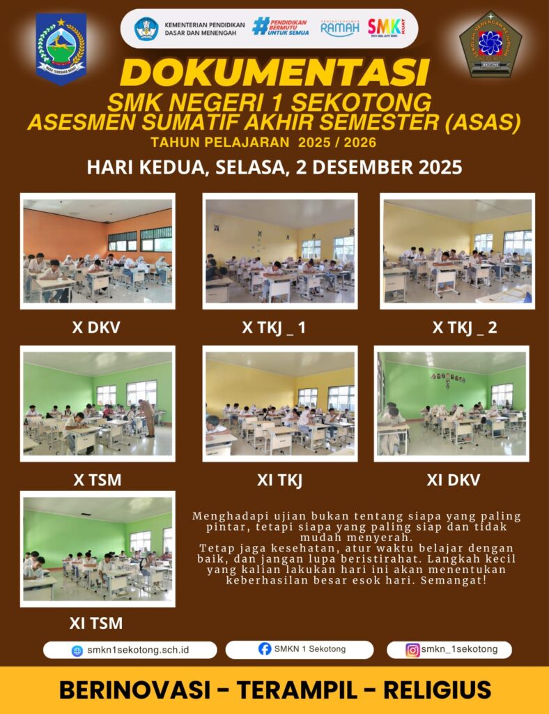 SMK Negeri 1 Sekotong melaksanakan Asesmen Sumatif Akhir Semester (ASAS) Tahun Pelajaran 2025/2026 mulai Senin, 1 Desember 2025. Pada hari kedua ini, seluruh peserta didik dari berbagai program keahlian mengikuti ujian dengan tertib dan penuh semangat.
