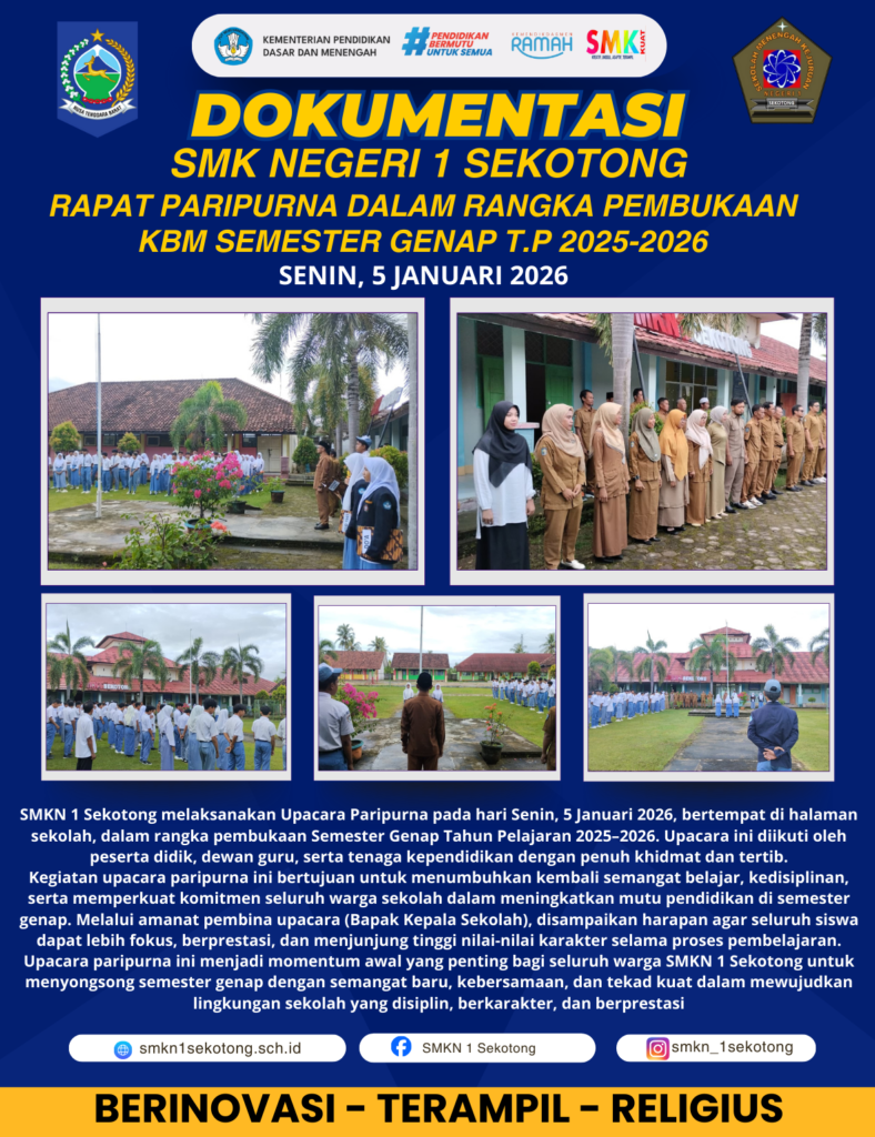 SMKN 1 Sekotong melaksanakan Upacara Paripurna dalam rangka pembukaan Semester Genap Tahun Pelajaran 2025β2026. Kegiatan ini diikuti oleh peserta didik, dewan guru, serta tenaga kependidikan dengan penuh khidmat, tertib, dan disiplin.